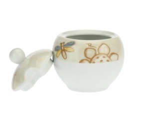 Misure:tazzina 110 ml; Ø 6,5 cm; 5,5 cm h; piattino Ø 11,5 cm; zuccheriera 11x11x120 cm h; 110 ml;